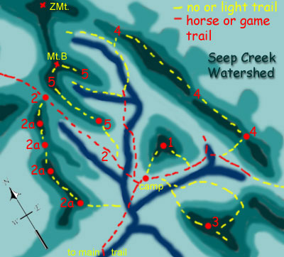 1. Knob above Seep Creek Camp. It's a very steep up, no trail. Start behind camp and keep climbing. Once on top, enjoy a pleasant stroll in an alpine meadow and a full panorama of the surrounding valleys and ridges. Return the same way or down a ridge, as shown, to the trail in the right branch of Seep Creek. 2. This route crosses the stream north of camp and goes up a valley to a saddle and finally to an alpine meadow that overlooks the south fork of Carson Creek. The trail continues from the overlook, drops into the South Fork of Carson Creek, rises again over a second saddle, and then drops down to the headwaters of Carson Creek and the main Carson Creek Trail on the North Fork. 2a. This is an alternate route to Carson Creek Overlook -- no trails, just follow the ridge. 3. Goat's Rest Knob and Ridge. Cross the south fork of Seep Creek, and begin to climb directly towards the obvious knob. Once up the ridge can be walked to its end and a different, cross-country return route can be selected. 4. Back Ridge - The back ridge is quite high, with very rough sheep trails once on top. It can be followed a long way and there are places where you can come down off the ridge to the valley behind the Seep Creek Camp Knob [#1]. A trace trail to the North takes you back to the south fork and there you will find a game/weak horse trail back to camp. 5. Zebra Mountain Ridge System -This is a steep climb up and an easy walk once up. An easy climb of Mt. Bazalgette [Mt.B] and a view of Zebra Mountain [ZMt.]. It's possible, but a very steep climb down or up the valley south of Mt. Bazlgette.