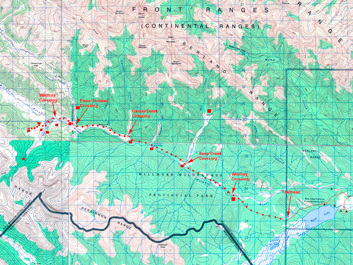 The topo maps we'll be on are: Rock Lake [83 E8]; Blue Creek [83 E7]; Adams Lookout [83 E10]; Moberly Creek [83 E9]. There's also a good map put out by the Alberta Forest Service and carried by some map shops. You can buy a set in Edmonton or Calgary at a map shop or MEC.